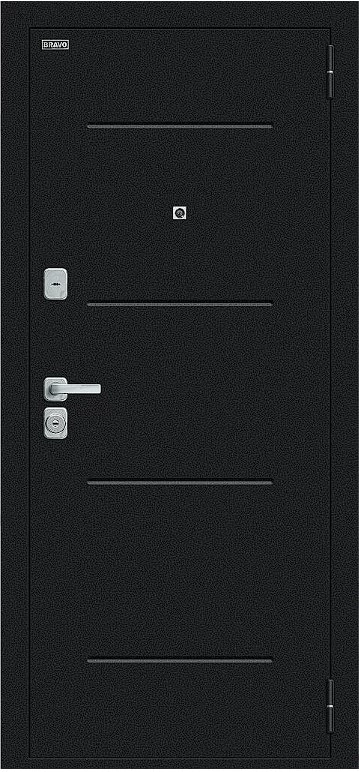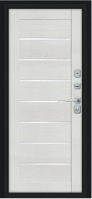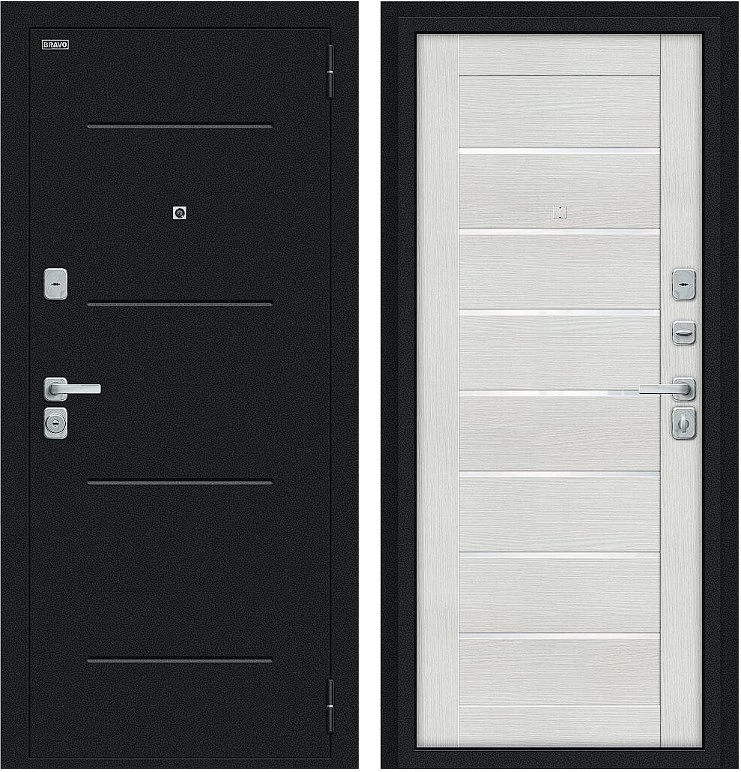 Надежная входная Дверь Браво Техно/BChrome Букле черное/Bianco Melinga премиум класса по цене 35 599 руб. Большая толщина стали защитит от проникновения в ваш дом, квартиру или коттедж. Используется очень качественная фурнитура: замки, цилиндры, ручки, защелки. Покрытие и отделка двери изготовлено под внимательным контролем производителя. Дверь имеет долгий срок службы и гарантию.